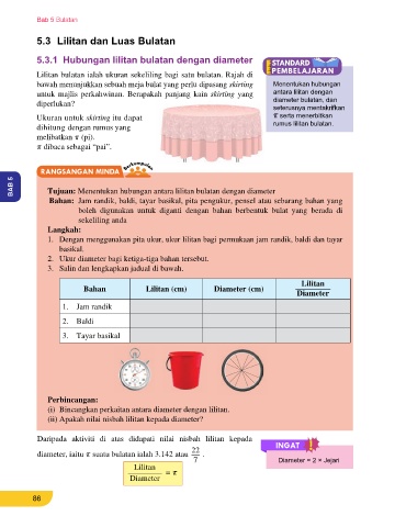5.3.1 Hubungan lilitan bulatan dengan diameter lilitan = π × diameter