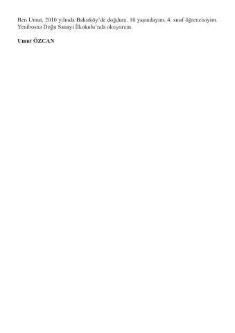 Ben Umut, 2010 yılında Bakırköy’de doğdum. 10 yaşındayım, 4. sınıf öğrencisiyim. Yenibosna Doğu Sanayi İlkokulu’nda okuyorum. Umut ÖZCAN