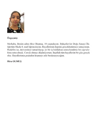 Merhaba, Benim adım Hira Okumuş. 10 yaşındayım. Bahçelievler Doğu Sanayi İlk-