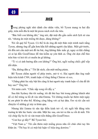 “Dạ, không đâu ạ.” Tôi lật sách, cắn một miếng pizza.