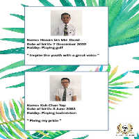 Name: Hossin bin Md Dzaid Date of birth: 7 December 2002 Hobby: Playing golf “ Inspire the youth with a great voice ” Name: Koh Chan Yap Date of birth: 8 June 2002 Hobby: Playing badminton “ Fixing my pride ”