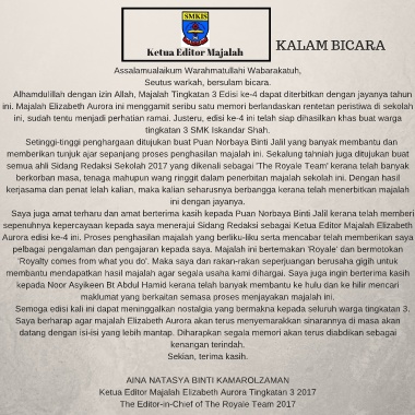 Ketua Editor Majalah Elizabeth Aurora Tingkatan 3 2017