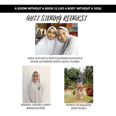 A ROOM WITHOUT A BOOK IS LIKE A BODY WITHOUT A SOUL AHLI SIDANG REDAKSI AINA NATASYA BINTI KAMAROLZAMAN & NOOR ASYIKEEN BINTI ABDUL HAMID MIESHA AMIERA BINTI NURUL SYAZLIANA KHAMALUDIN BINTI ROSLI