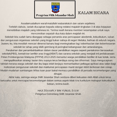Akhir kata, semoga warga SMK Iskandar Shah sentiasa diberi kekuatan oleh Allah untuk terus
