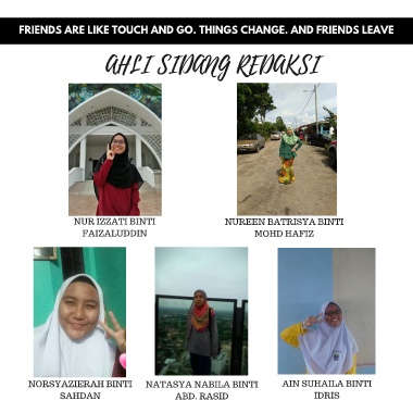 FRIENDS ARE LIKE TOUCH AND GO. THINGS CHANGE. AND FRIENDS LEAVE AHLI SIDANG REDAKSI NUR IZZATI BINTI NUREEN BATRISYA BINTI FAIZALUDDIN MOHD HAFIZ NORSYAZIERAH BINTI NATASYA NABILA BINTI AIN SUHAILA BINTI SAHDAN ABD. RASID IDRIS