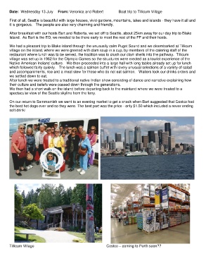 Date: Wednesday 13 July From: Veronica and Robert Boat trip to Tillicum Village