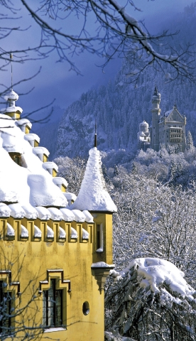 A wintry Bavarian scene, with Neuschwanstein Castle in the background