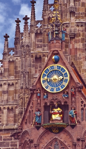Clock face of the brick Gothic Frauenkirche, or Church of Our Lady, in Nuremberg