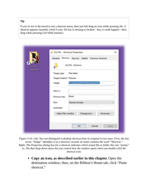 Figure 3-10. Left: You can distinguish a desktop shortcut from its original in two ways. First, the tiny