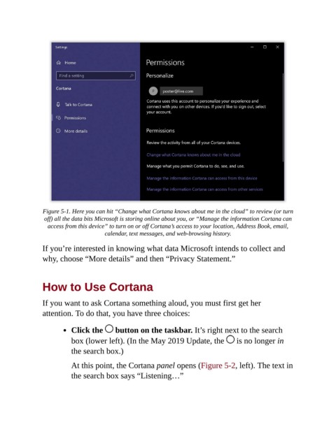 Figure 5-1. Here you can hit “Change what Cortana knows about me in the cloud” to review (or turn