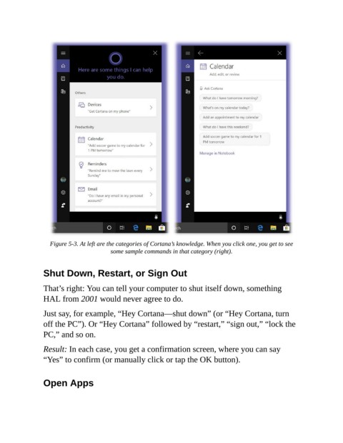 Figure 5-3. At left are the categories of Cortana’s knowledge. When you click one, you get to see