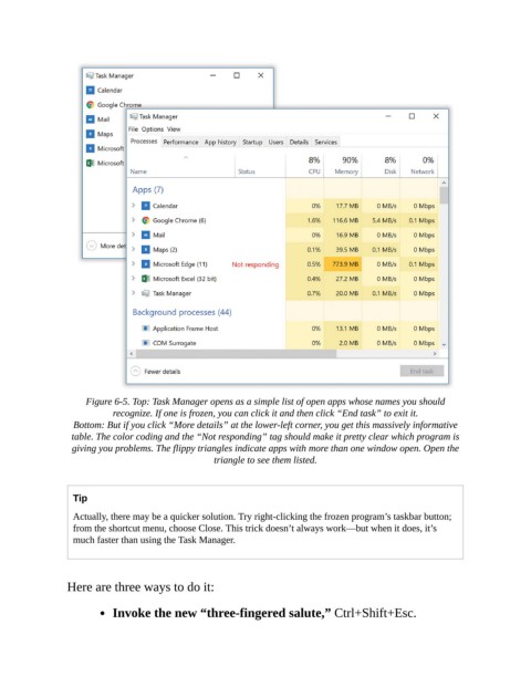 Figure 6-5. Top: Task Manager opens as a simple list of open apps whose names you should