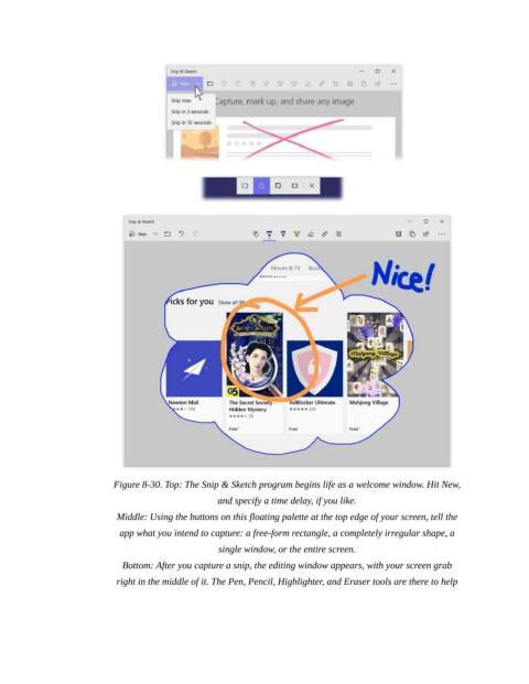 Figure 8-30. Top: The Snip & Sketch program begins life as a welcome window. Hit New,