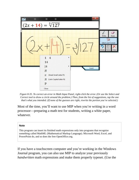 Figure 8-35. To correct an error in Math Input Panel, right-click the error. (Or use the Select and