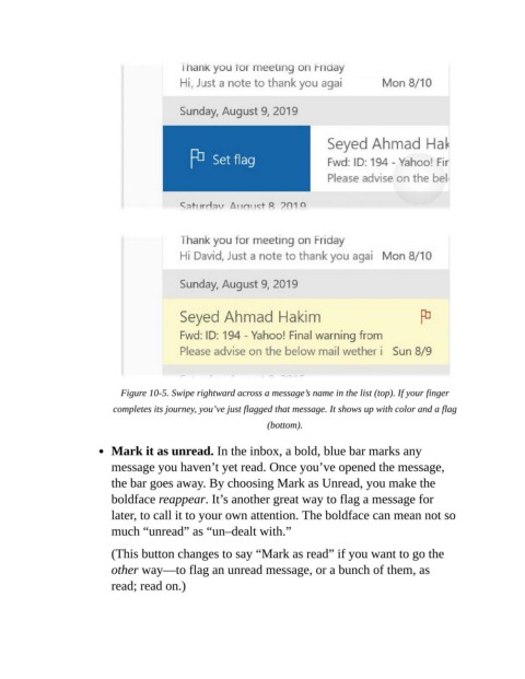 Figure 10-5. Swipe rightward across a message’s name in the list (top). If your finger