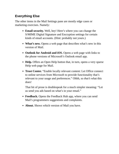 The other items in the Mail Settings pane are mostly edge cases or