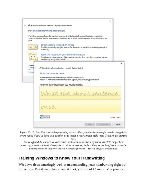 Figure 12-10. Top: The handwriting training wizard offers you the chance to fix certain recognition