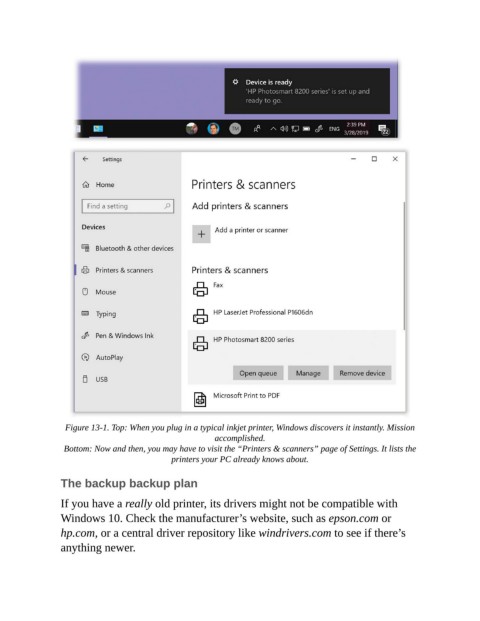 Figure 13-1. Top: When you plug in a typical inkjet printer, Windows discovers it instantly. Mission