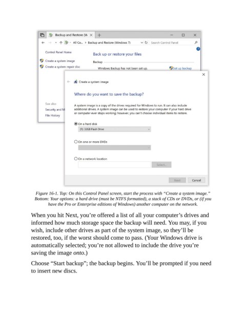 Figure 16-1. Top: On this Control Panel screen, start the process with “Create a system image.”
