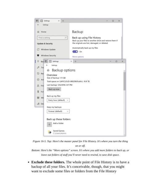 Figure 16-5. Top: Here’s the master panel for File History. It’s where you turn the thing