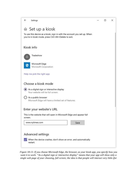 Figure 18-13. If you choose Microsoft Edge, the browser, as your kiosk app, you specify how you