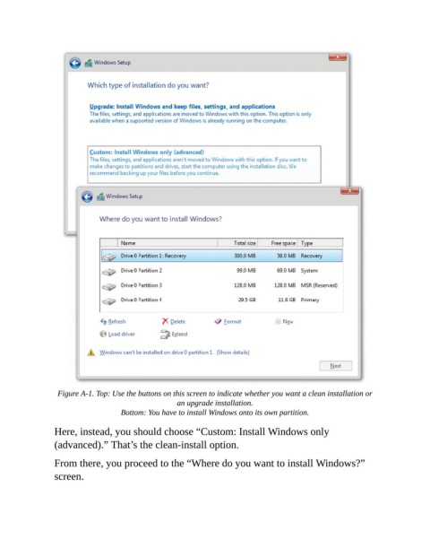 Figure A-1. Top: Use the buttons on this screen to indicate whether you want a clean installation or