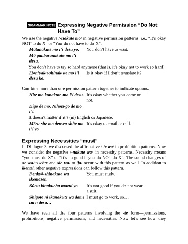 We use the negative /-nakute mo/ in negative permission patterns, i.e., “It’s okay