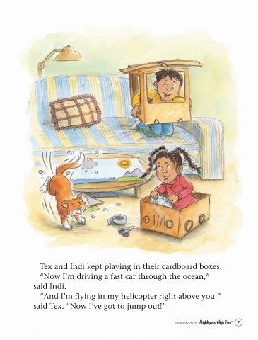 Tex and Indi kept playing in their cardboard boxes. “Now I’m driving a fast car through the ocean,” said Indi. “And I’m flying in my helicopter right above you,” said Tex. “Now I’ve got to jump out!” February 2019 7