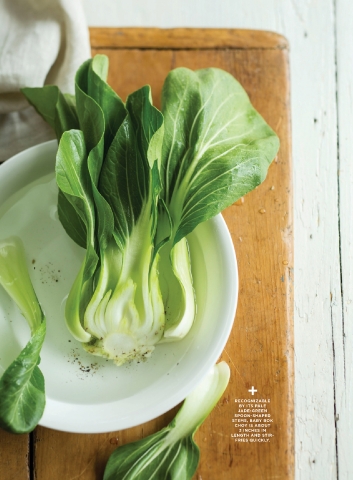 RECOGNIZABLE BY ITS PALE JADE-GREEN SPOON-SHAPED STEMS, BABY BOK CHOY IS ABOUT 3 INCHES IN LENGTH AND STIR- FRIES QUICKLY.