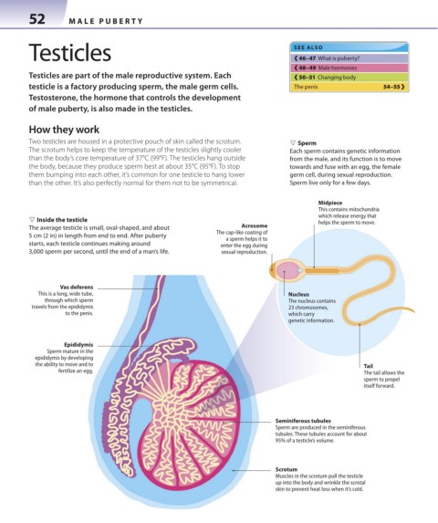 Testicles are part of the male reproductive system. Each ‹ 50–51 Changing body