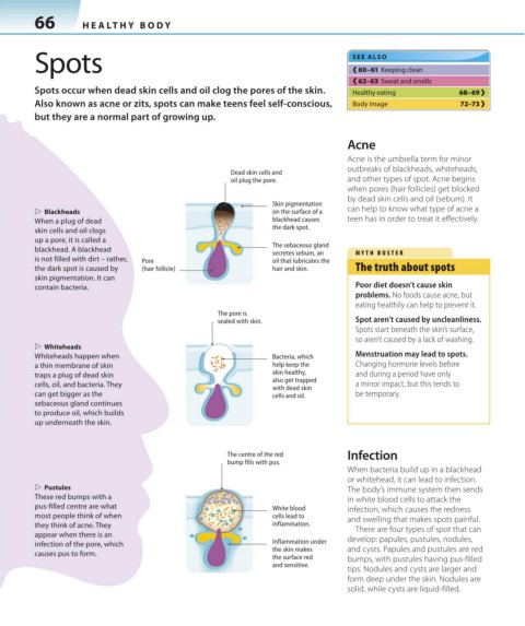 Spots occur when dead skin cells and oil clog the pores of the skin. Healthy eating 68–69 ›