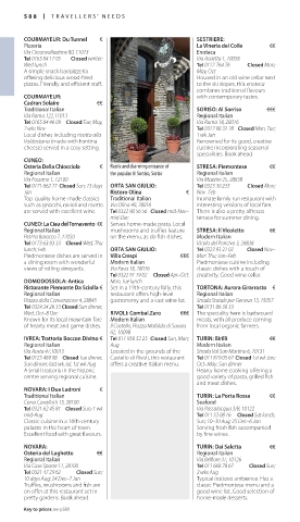 IVREA: Trattoria Boccon Divino € Tel 011 956 52 25 Closed Sun, Mon; TURIN: Birilli €€