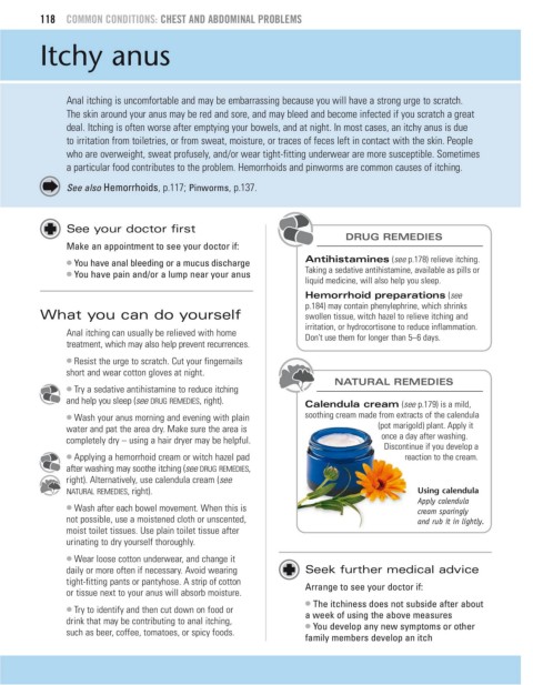 ● You have anal bleeding or a mucus discharge Antihistamines (see p.178) relieve itching.