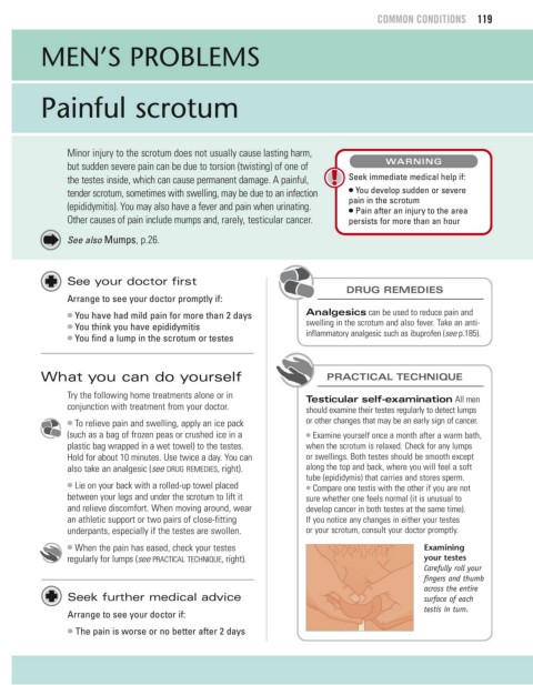 plastic bag wrapped in a wet towel) to the testes. when the scrotum is relaxed. Check for any lumps