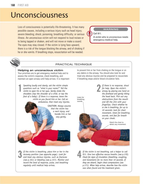 recovery position (see opposite page). Look for 911. Give two effective rescue breaths (see p.170).