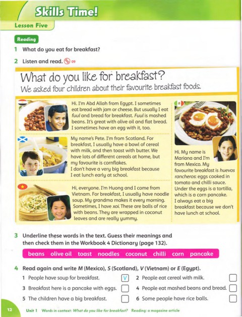 4 Read again and write M (Mexico), 5 (Scotland), V (Vietnam) or E (Egypt).