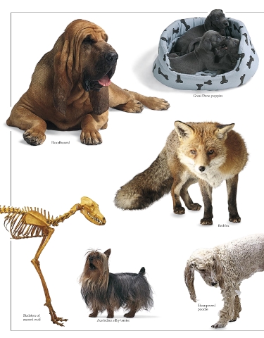 Great Dane puppies Bloodhound Red fox Shampooed poodle Skeleton of maned wolf Australian silky terrier (c) 2011 Dorling Kindersley. All Rights Reserved.