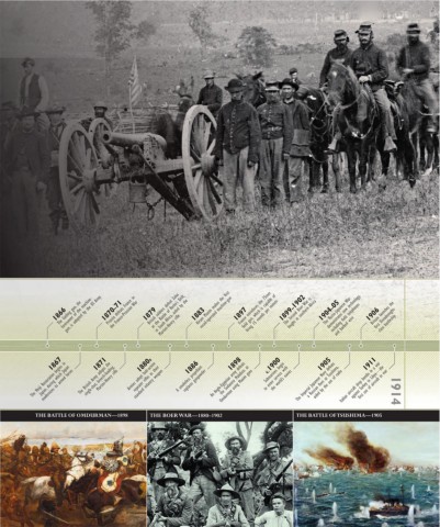 The Gatling gun, the 1870–71 British soldiers defeat Zulus Hiram Maxim makes the first France introduces the 75mm 1899–1902 1904–05 Britain launches the