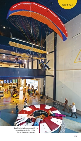 Must See Exhibits, including a colourful paraglider, on display at the Swiss Transport Museum 209 208-209_EW_Switzerland.indd 209 15/11/2018 11:00