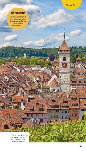 Must See Did You Know? Schaffhausen has 171 oriel windows – more than any other Swiss town – built as status symbols. The town and the 11th-century Kirche St Johann, seen from the Munot fortress 243 242-243_EW_Switzerland.indd 243 14/11/2018 13:34