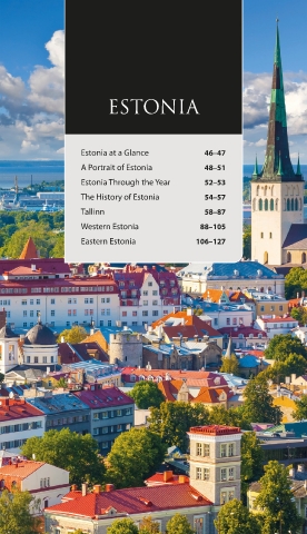 ESTONIA Estonia at a Glance 46–47 A Portrait of Estonia 48–51 Estonia Through the Year 52–53 The History of Estonia 54–57 Tallinn 58–87 Western Estonia 88–105 Eastern Estonia 106–127