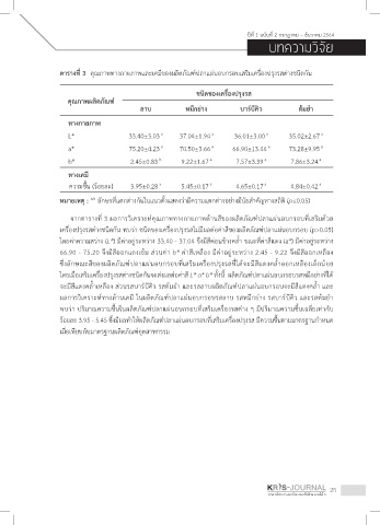 โดยค่าความสว่าง (L*) มีค่าอยู่ระหว่าง 33.40 - 37.04 จึงมีสีค่อนข้างคลา ขณะท่ค่าสีแดง (a*) มีค่าอยู่ระหว่าง