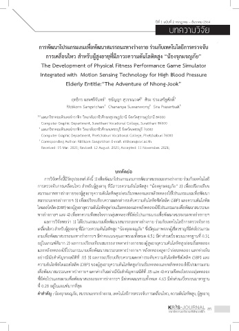 คาสาคัญ : น้องจุกผจญภัย, สมรรถนะทางร่างกาย, เทคโนโลยีการตรวจจับการเคล่อนไหว, ความดันโลหิตสูง, ผู้สูงอาย ุ
