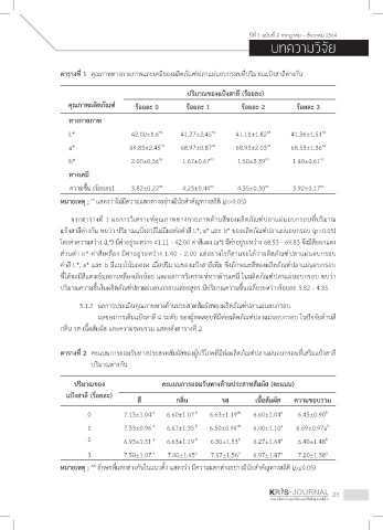 จากตารางท่ 1 ผลการวิเคราะห์คุณภาพทางกายภาพด้านสีของผลิตภัณฑ์ปลาแผ่นอบกรอบท่ปริมาณ