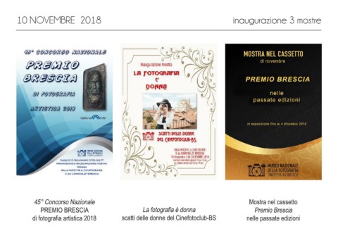10 NOVEMBRE 2018 inaugurazione 3 mostre 45° Concorso Nazionale Mostra nel cassetto PREMIO BRESCIA La fotografia è donna Premio Brescia di fotografia artistica 2018 scatti delle donne del Cinefotoclub-BS nelle passate edizioni