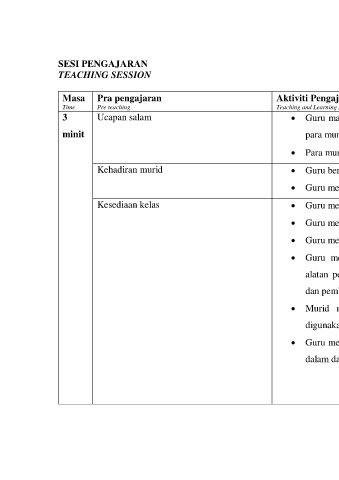 Masa Pra pengajaran Aktiviti Pengajaran dan Pembelajaran Catatan