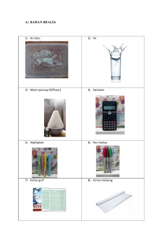 A) BAHAN REALIA 1) Ais batu 2) Air 3) Mesin peresap (Diffuser) 4) Kalulator 5) Highlighter 6) Pen marker 7) Kertas graf 8) Kertas mahjong