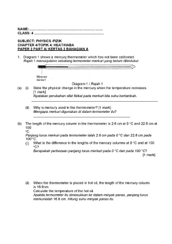 1. Diagram 1 shows a mercury thermometer which has not been calibrated.