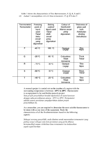 (d) Jadual 1 menunjukkan ciri-ciri lima termometer, P, Q, R S dan T.