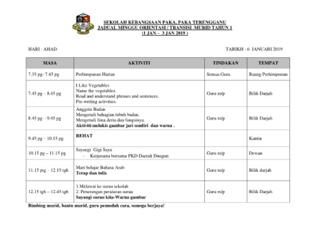 JADUAL MINGGU ORIENTASI / TRANSISI MURID TAHUN 1